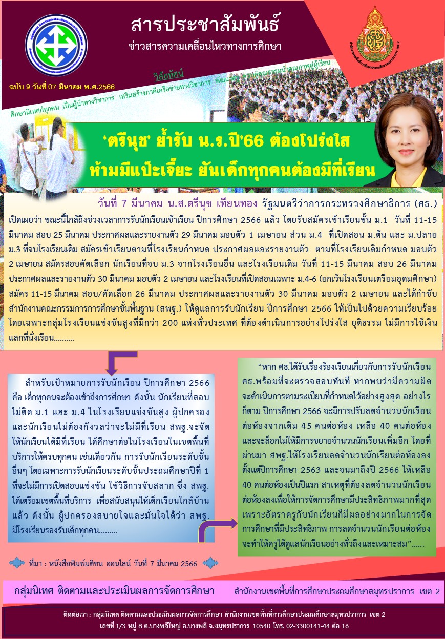 ตรีนุชย้ำ รับนักเรียน ปี 2566 ต้องโปร่งใส ห้ามมีแป๊ะเจ๊ยะ